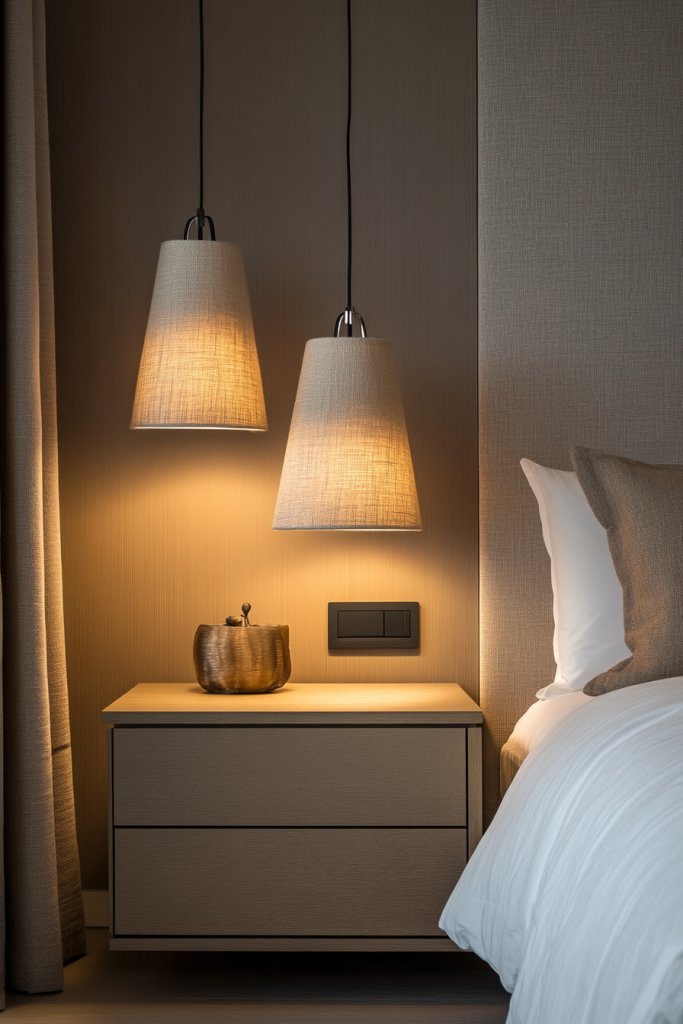 Ever wish your bedside lighting could be both stylish and gentle? Pendant lamps with soft fabric shades provide a warm, inviting glow while saving space on your nightstand. They add a layer of elegance and texture, elevating your bedroom decor. Say goodbye to bulky lamps and hello to streamlined sophistication.