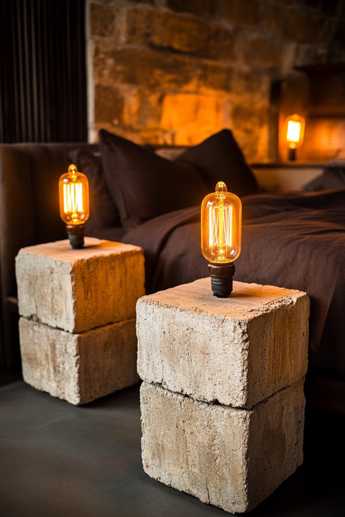17. Rustic Masonry Block Lamps with Warm Edison Bulbs