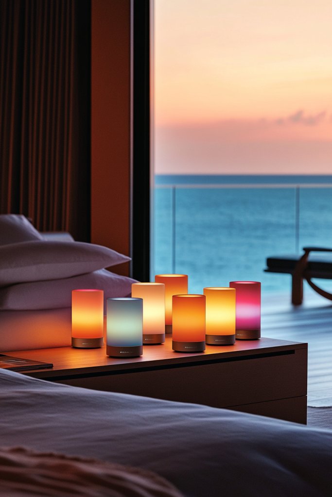 Mix and match bases and shades for an eclectic look, or keep uniformity for a streamlined appearance. Use remote controls or smartphone apps to change colors and brightness, making adjustments effortless. For a more subtle effect, set all lamps to a single color or cycle through hues slowly. This idea works well in bedrooms with contemporary or boho decor, and can be scaled up by adding more lamps or integrating with smart home systems.