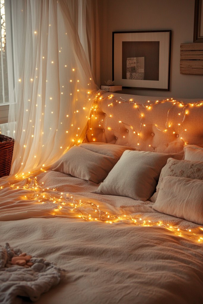 5. Fairy String Lights Draped Over Headboard for a Dreamy Atmosphere