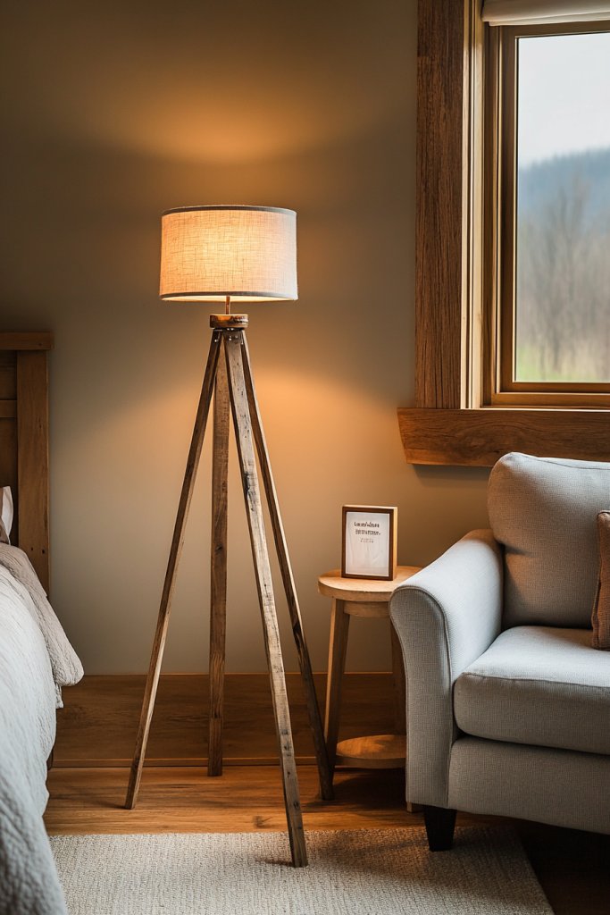 8. Reclaimed Wood Tripod Floor Lamps for a Cozy Corner