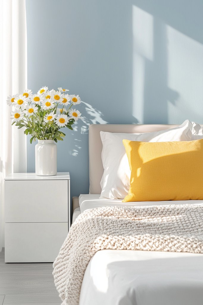 This soothing backdrop creates a sense of tranquility, perfect for unwinding after a long day. To complement the blue, introduce lemon yellow accents—think bright throw pillows, vibrant artwork, or even a cheerful bedspread.