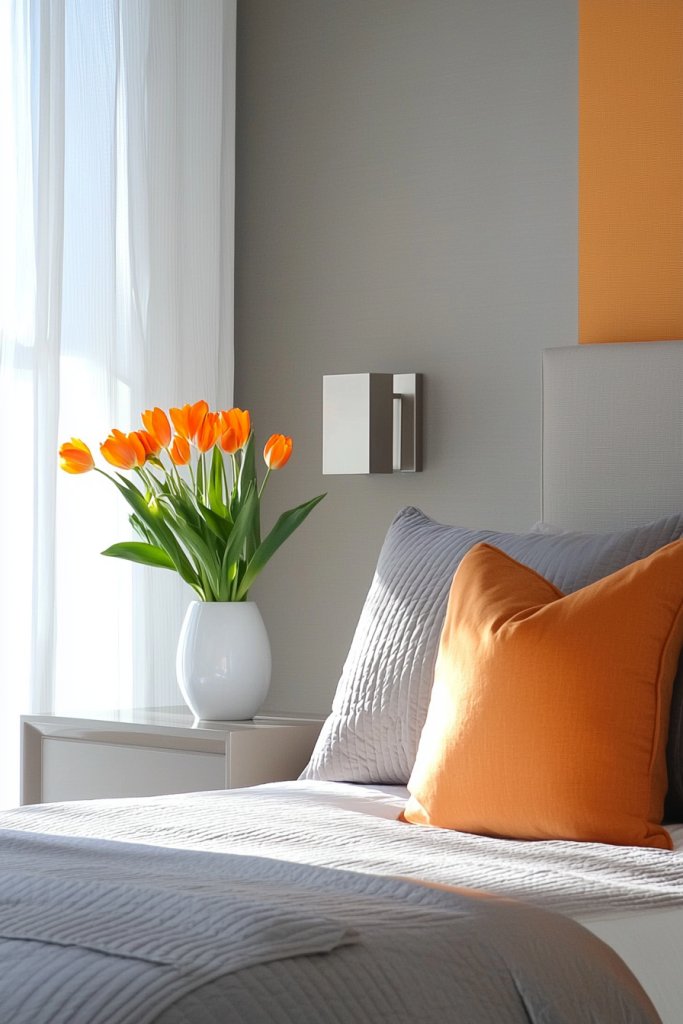 If you’re looking to infuse your bedroom with energy and warmth, the combination of sunny orange and soft gray could be just what you need. Picture vibrant orange accents—think throw pillows, artwork, or a cozy blanket—bringing a burst of cheerfulness to your space.