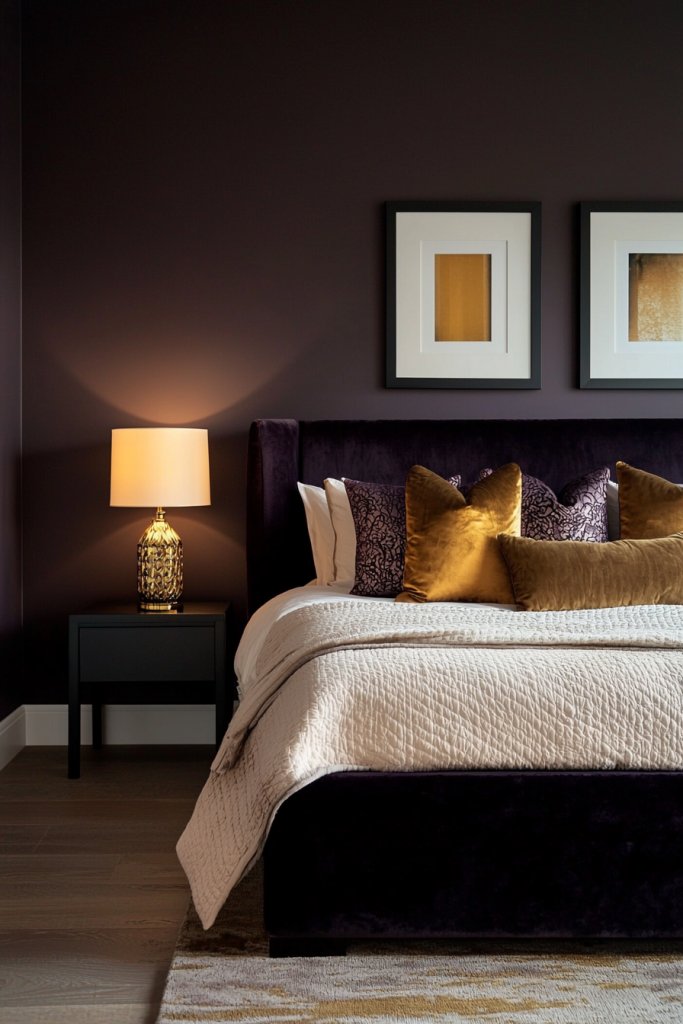 Imagine deep plum walls adorned with gold accents, from the bedding to decorative pillows. The contrast draws the eye and adds depth, turning your space into a lavish retreat.