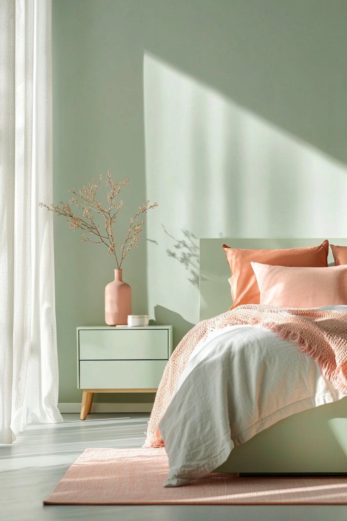 Picture mint green walls, reminiscent of a tranquil sea breeze, seamlessly complemented by coral pink accents in your bedding or curtains. To enhance this combination, consider incorporating natural materials like light wood or rattan furniture, which can ground the bright colors.
