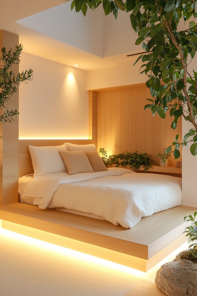 Opt for a low-profile bed, perhaps a tatami-style platform, adorned with soft organic fabrics that encourage relaxation. Incorporate sliding shoji screens to diffuse light and add an authentic Japanese touch, enhancing the serene atmosphere.