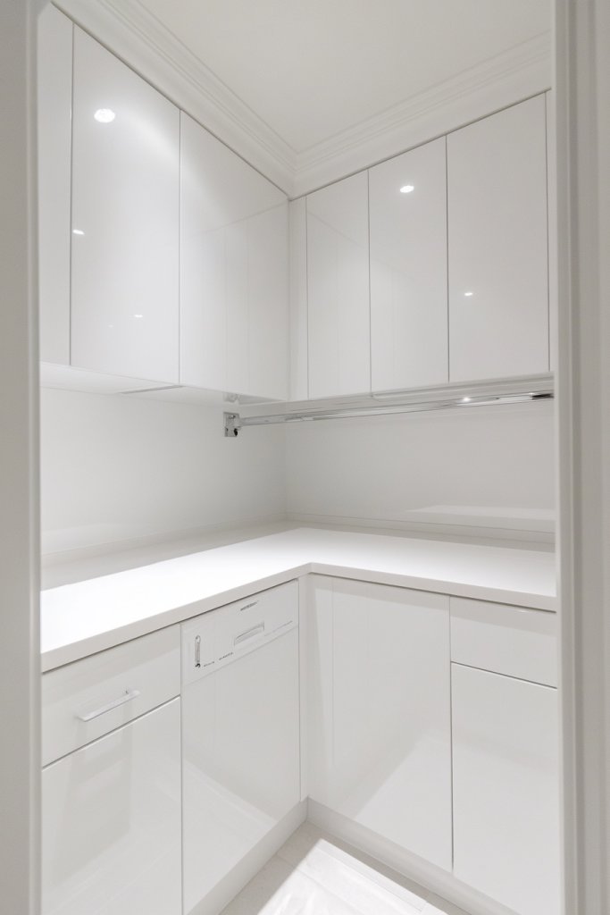 Imagine a compact laundry nook with sleek, glossy white cabinets that bounce sunlight around. The smooth surface catches the eye, creating a clean, airy atmosphere. Soft textures like a fluffy towel or a matte ceramic container add contrast without cluttering the visual field. Overall, the space feels brighter, more spacious, and effortlessly tidy.