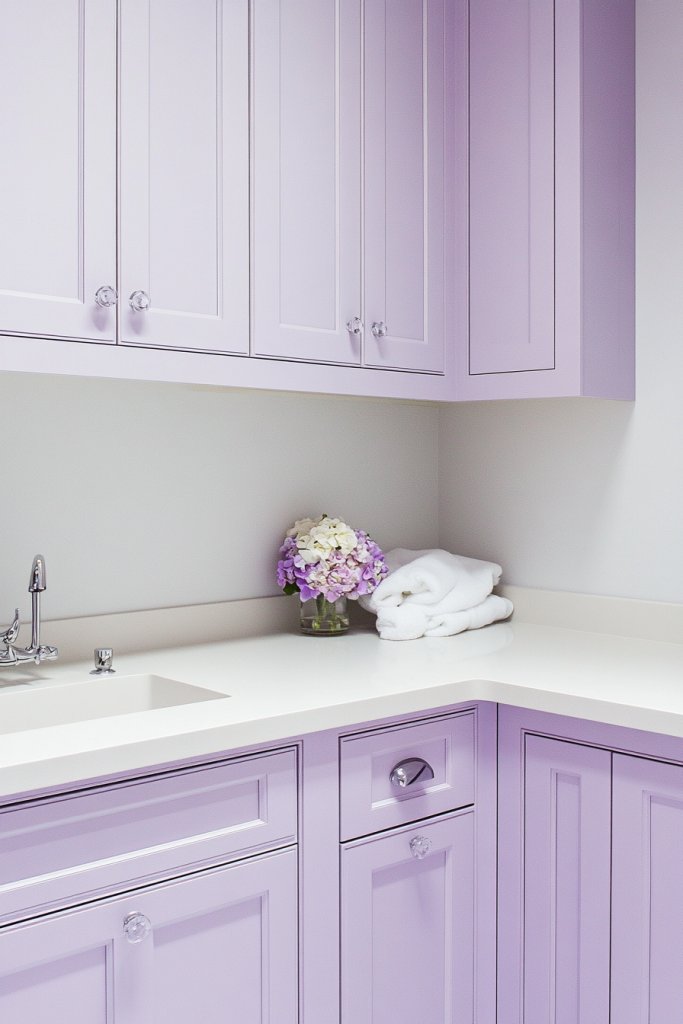 Opt for a deeper plum for a more dramatic look or stick with pastel lilac for a delicate vibe. Hardware in brushed nickel or polished chrome complements the soft tones. Seasonal updates like lavender-scented sachets or subtle decals can keep the room feeling fresh.
