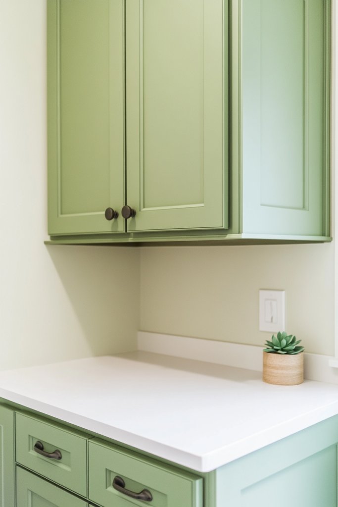 Visualize cabinets in muted olive or sage with a matte or eggshell finish that absorbs light softly. Pair with natural wood accents and textured textiles like a woven basket or linen towels to enhance the organic feel. Add small decorative elements like a ceramic dish or a fabric storage bin in complementary shades for a grounded, earthy look.