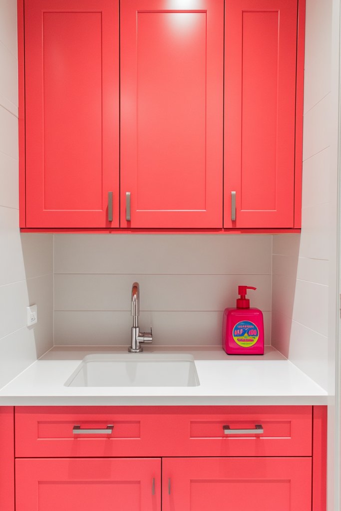Bored of your dull laundry space? Bright coral is here to shake things up with a cheerful, energetic vibe. It’s a bold choice that turns a small, overlooked corner into a lively focal point. Who says laundry can’t be fun?