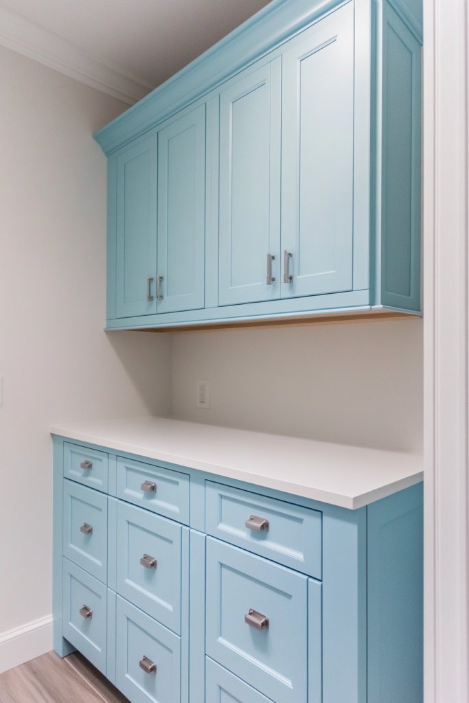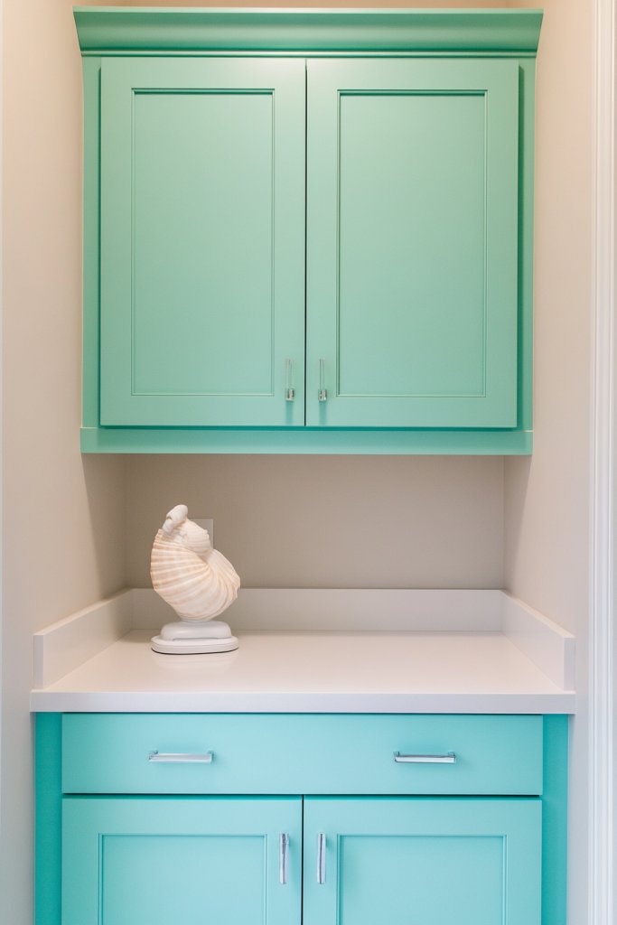 Imagine cabinets painted in a soft turquoise with a satin finish reflecting ambient light. Pair with white or light beige walls to enhance the airy feel. Add textured textiles like a woven basket or a linen cloth to reinforce the coastal theme. Small decorative accents in shell or driftwood-inspired details can subtly complete the look.