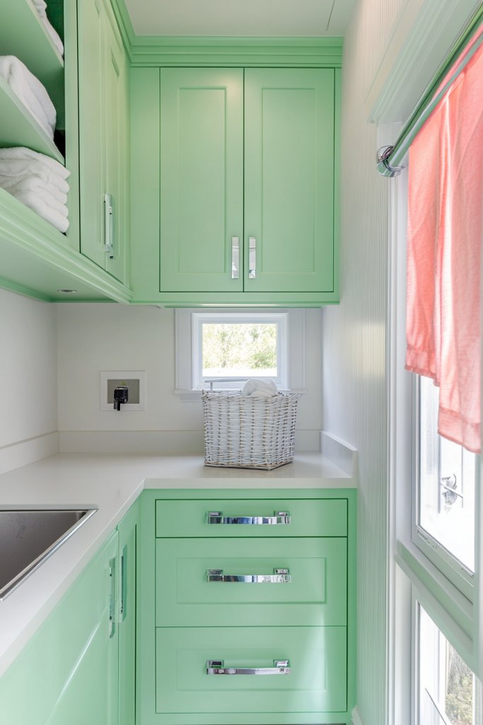 Bright mint green breathes new life into a small laundry room, making it feel more inviting and energetic. It’s a fun choice for those who want a splash of personality without going overboard. Once you see the transformation, you’ll realize how a bold color can make chores feel a little less dull.