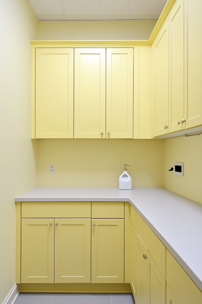 Visualize cabinets painted in a soft, buttery yellow paired with white or light gray walls. The warm hue reflects natural light, making the room feel more expansive and inviting. Complement with textured textiles like a cozy rug or a woven laundry basket to add tactile warmth and charm.