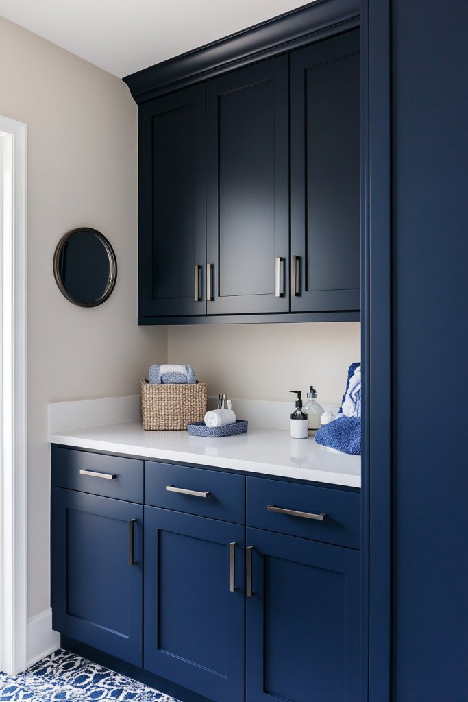 Visualize navy cabinets with a matte or satin finish contrasted against crisp white walls. The dark hue creates depth and anchors the space, making it look more polished. Complement with metallic or matte black hardware for a modern, sleek vibe. Light-colored textiles or accessories pop against the dark background, adding visual interest.
