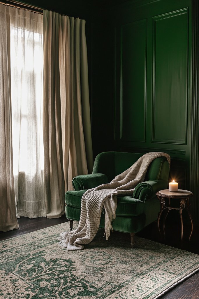 Imagine walls painted in rich, velvety green that absorb light and add depth to your space. Complement it with plush, textured throws and cozy seating that invite lingering. The dark hue pairs perfectly with warm wood accents and soft lighting, creating a sanctuary that feels both luxurious and inviting. It’s like stepping into a lush forest without leaving your home.