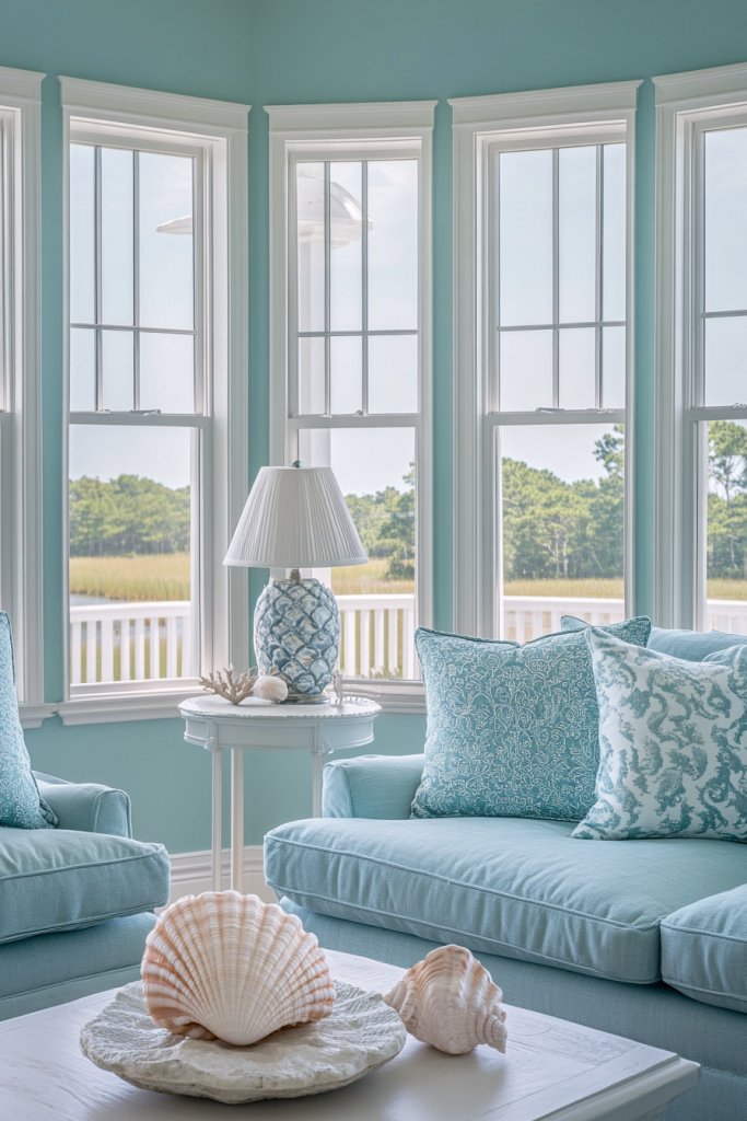 Pair with light wood furniture and woven accessories for a truly coastal look. For a more modern twist, incorporate sleek white or glass elements. Seasonal updates can include nautical-themed textiles or coral accents. Small spaces benefit from minimal decor and strategic lighting, while larger rooms can handle layered textures and statement curtains.