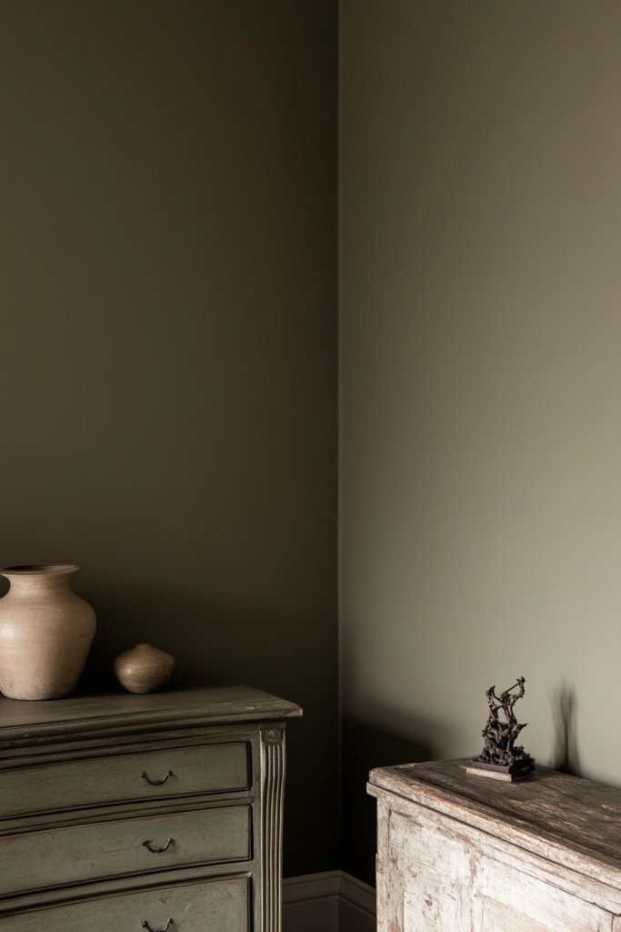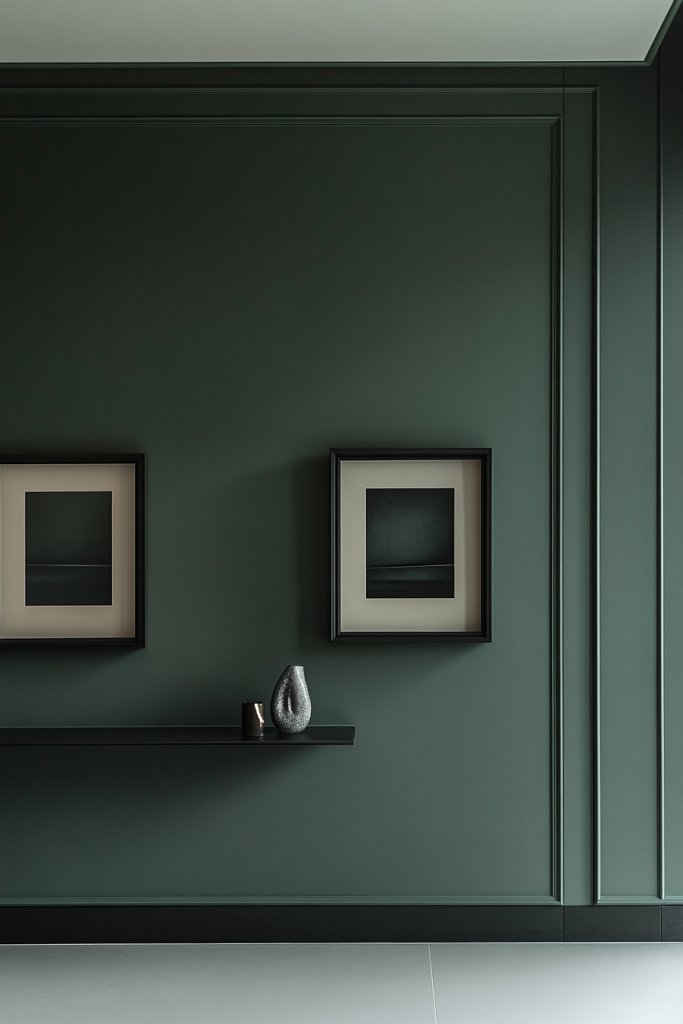 Visualize a space with deep, muted green walls complemented by clean-lined furniture and subtle metallic accents. Keep accessories to a minimum—perhaps a single sculptural piece or a textured textile. Use matte or satin finishes to enhance the subdued, refined look. Soft lighting highlights the muted tones, creating a peaceful, clutter-free environment. It’s a sophisticated retreat from chaos.