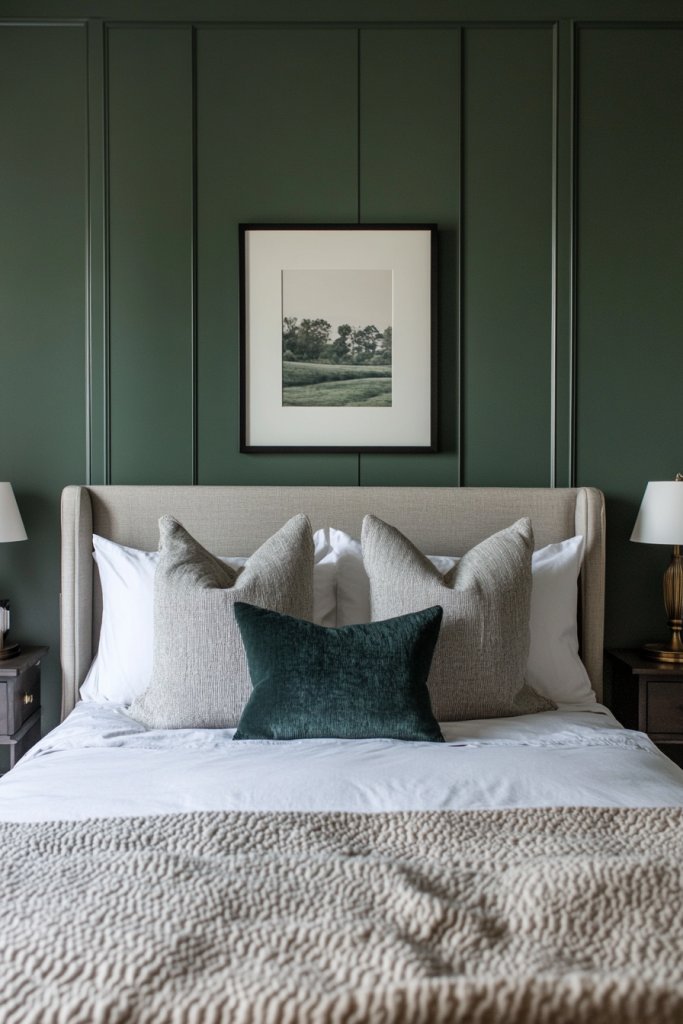 Imagine walls in a muted green-gray, paired with sleek furniture and soft, layered bedding. Incorporate textures like velvet or brushed cotton to add comfort and visual interest. Use subtle lighting to enhance the mood—think bedside sconces or dimmable LEDs. Minimal decor allows the color to shine, creating a serene retreat that feels contemporary and chic.