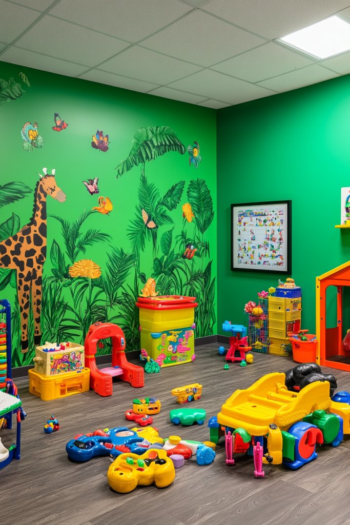 A jungle green accent wall transforms a basic playroom into an adventure zone. It encourages kids to explore and imagine freely. Bold colors like this show that playful environments can be both stylish and inspiring. Ready to turn your play area into a jungle adventure? Go for it!
