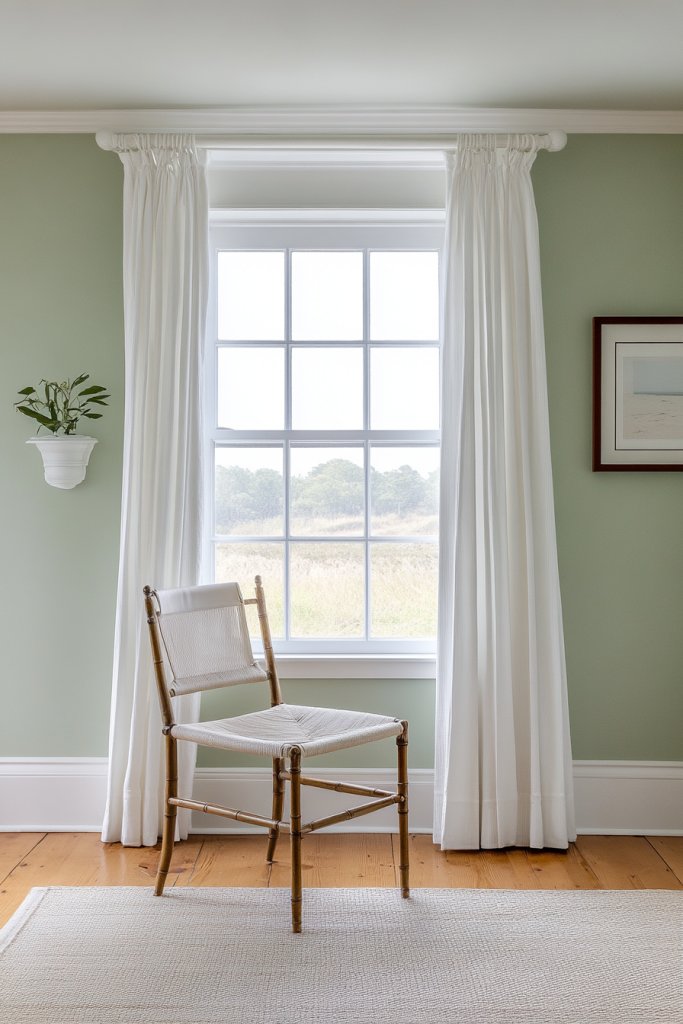 Visualize soft, muted green walls complemented by bright white trim and airy curtains. Incorporate natural textures like linen or jute for a beachy feel. Add decor in shades of blue, sandy beige, or coral for subtle pops of color. The room feels open, light, and full of calming energy—like a gentle ocean breeze. It’s a look that never goes out of style.