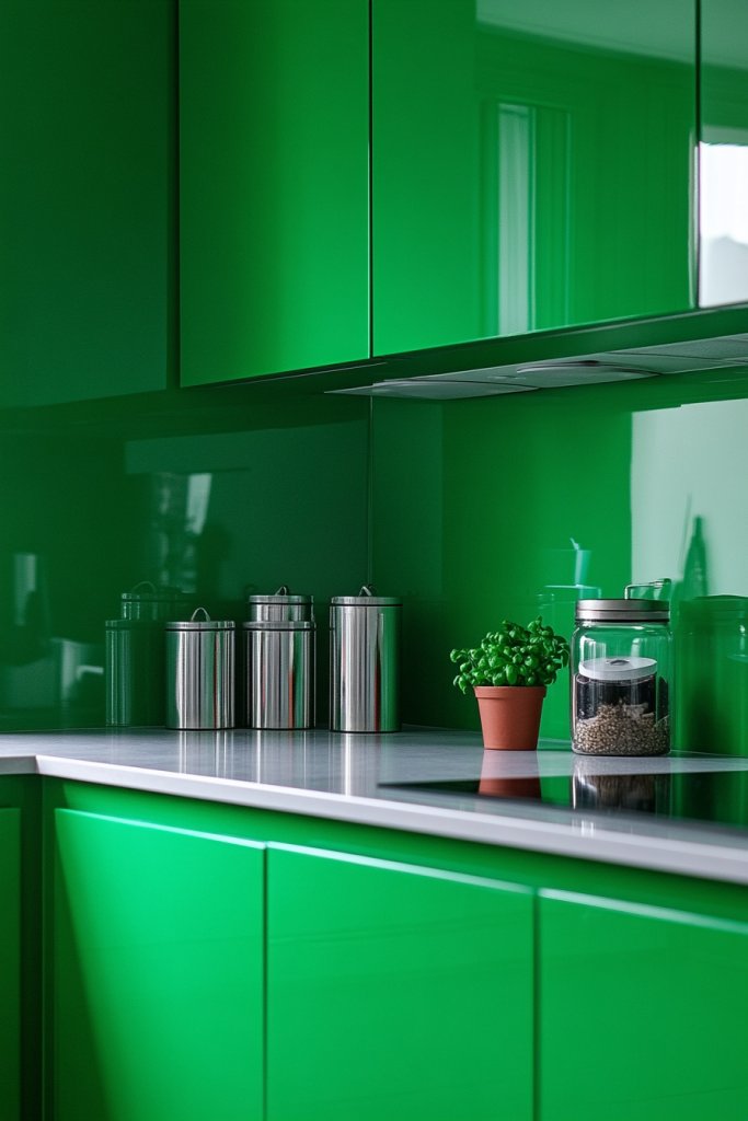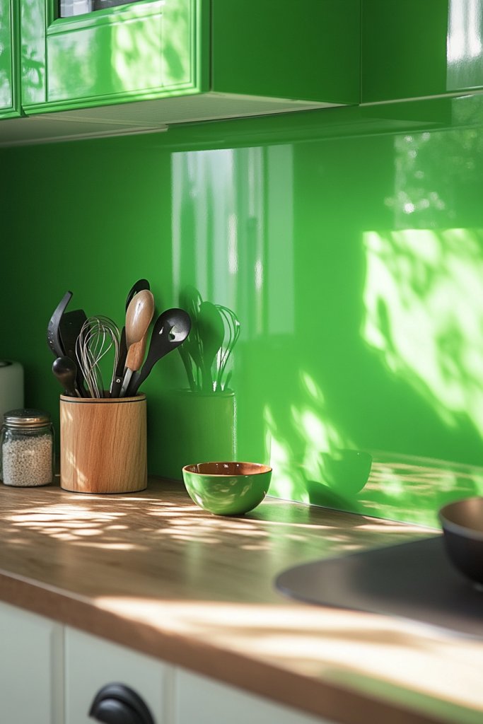 Personalize with sleek, modern hardware and minimalist accessories. Use textured or patterned tiles to add interest without cluttering. Incorporate personal touches like colorful utensils or decorative jars in complementary shades. Keep your design simple to let the green stand out and refresh your culinary zone.