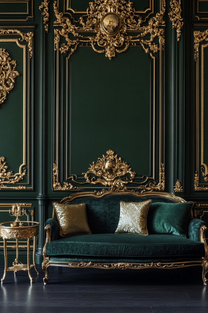 Imagine walls painted in deep, moody green, highlighted by warm gold fixtures and accessories. Add plush velvet furniture and layered textiles in metallics or jewel tones for a sumptuous feel. Soft lighting, such as table lamps or sconces, accentuates the richness. Incorporate ornate mirrors or decorative objects to amplify the luxe atmosphere. It’s a space that commands attention.