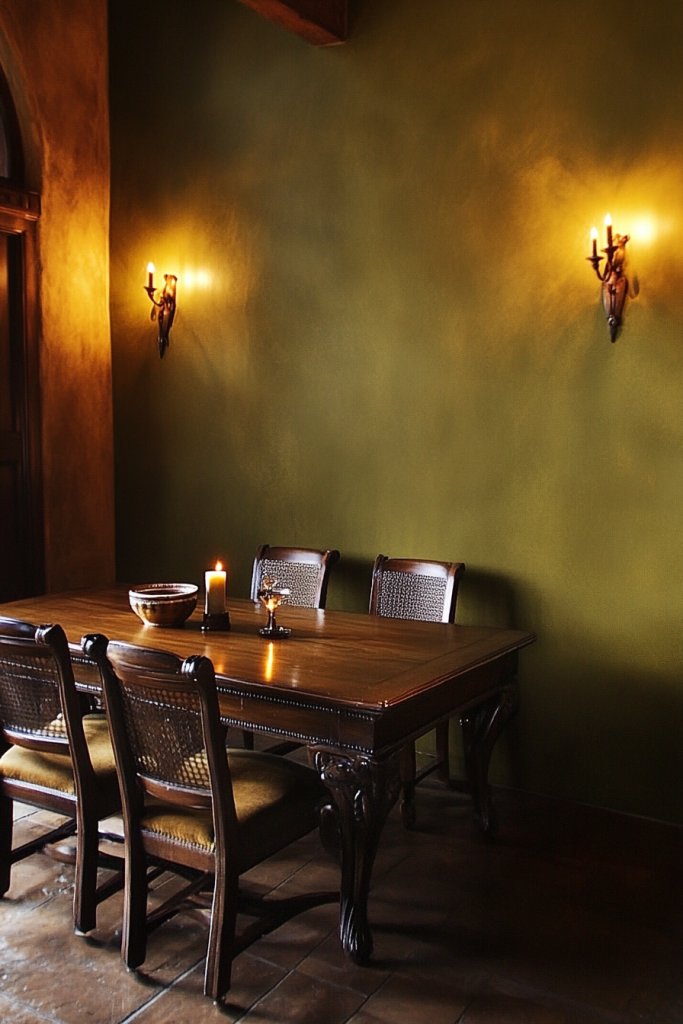 3. Olive Green Accent Walls to Add Warmth to Dining Areas
