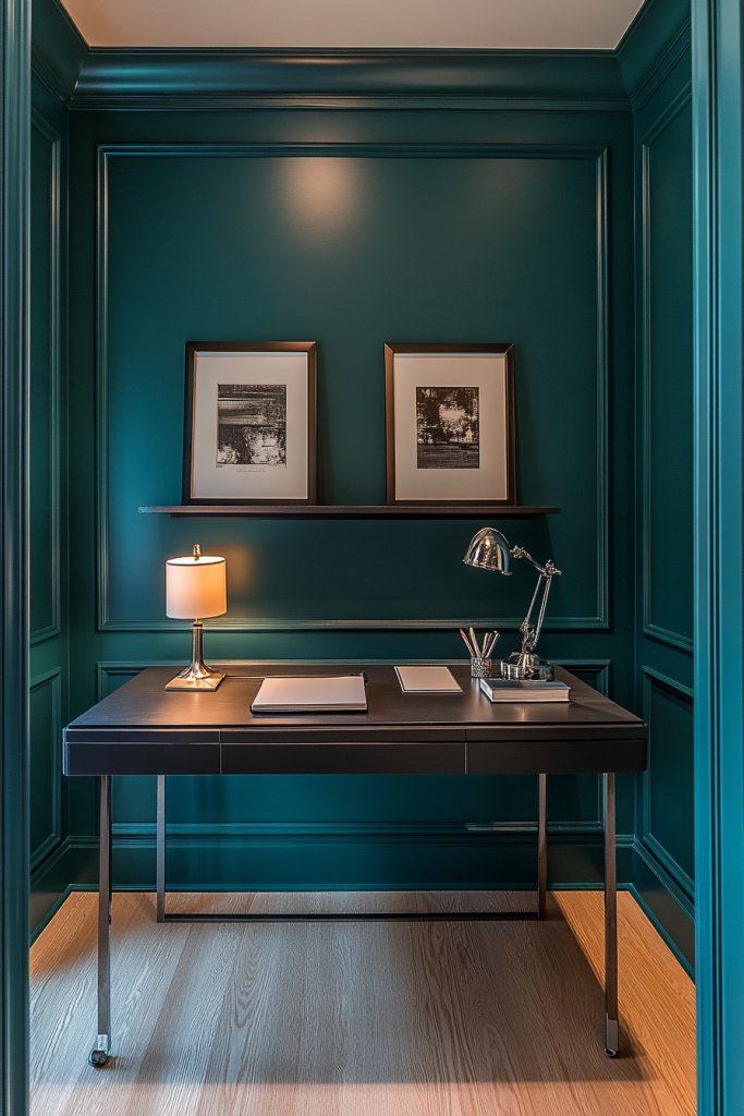 Picture walls painted in rich teal, accented by sleek black or metallic furniture. Add a plush rug and layered textiles to create a cozy yet professional environment. Soft lighting, such as sconces or task lamps, enhances the calming effect. Keep clutter minimal with smart storage solutions. The room feels balanced—inviting for work, peaceful for breaks.