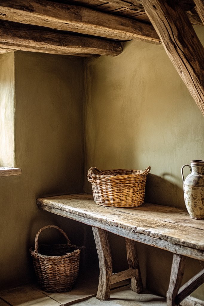 Envision walls painted in warm, muted khaki paired with distressed wood furniture and woven textiles. Add vintage-inspired accessories like lanterns or antique mirrors. A soft, plush rug anchors the space, enhancing the cozy vibe. Natural light filters through sheer curtains, highlighting the subtle green undertones. It’s a space that feels like a well-loved countryside cottage.