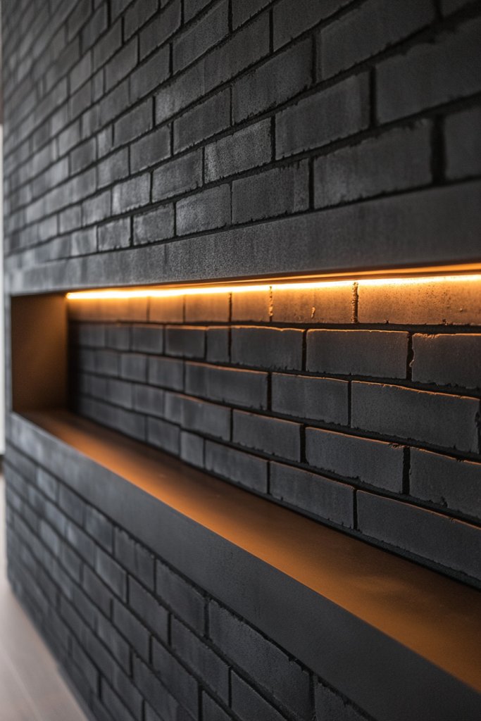10. Black Brick Fireplace with Embedded LED Accent Lighting