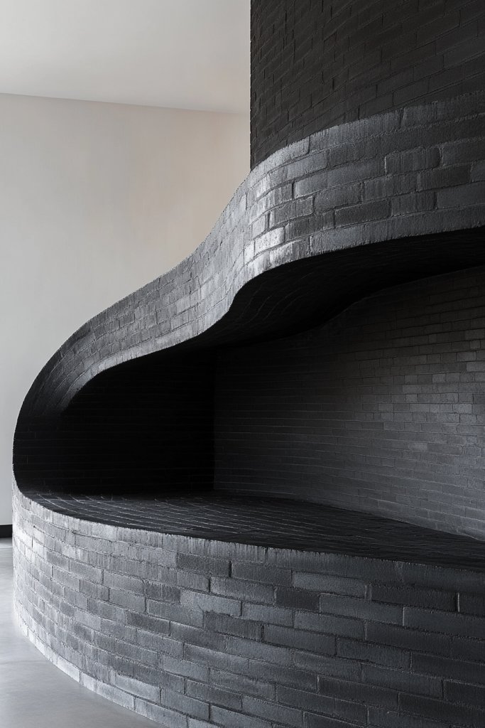 11. Curved Black Brick Fireplace for a Soft, Sculptural Look