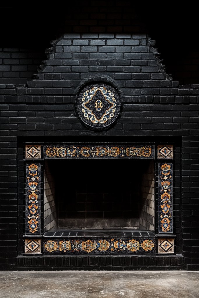 12. Black Brick Fireplace with Artistic Tile Inlays or Mosaics