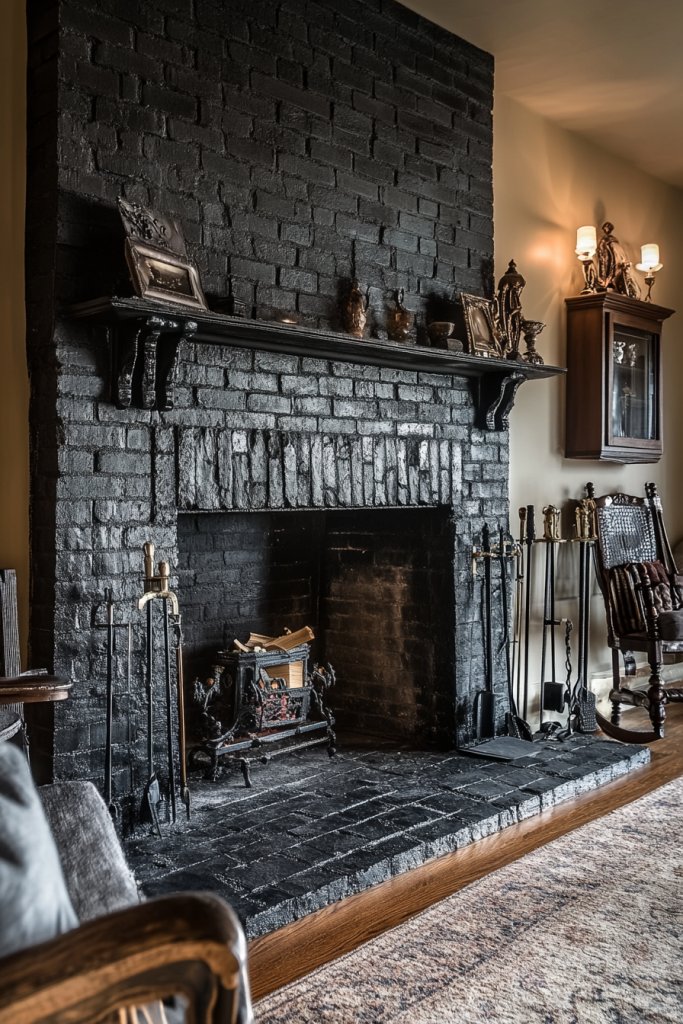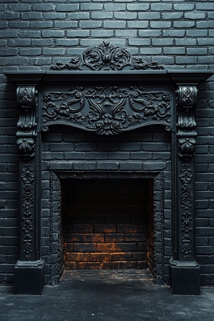 19. Vintage-Inspired Black Brick Fireplace with Ornate Detailing