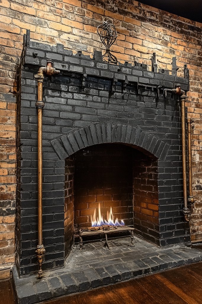 2. Industrial-Style Black Brick Fireplace with Reclaimed Metal Accents