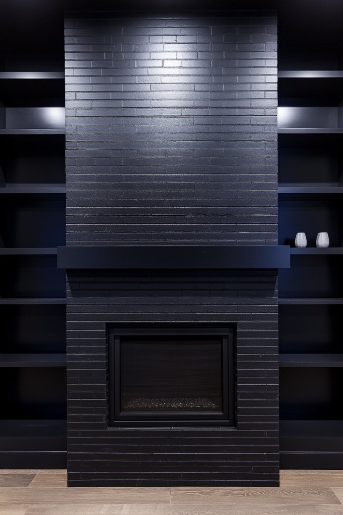 14. Black Brick Fireplace with Recessed Firebox and Hidden Storage