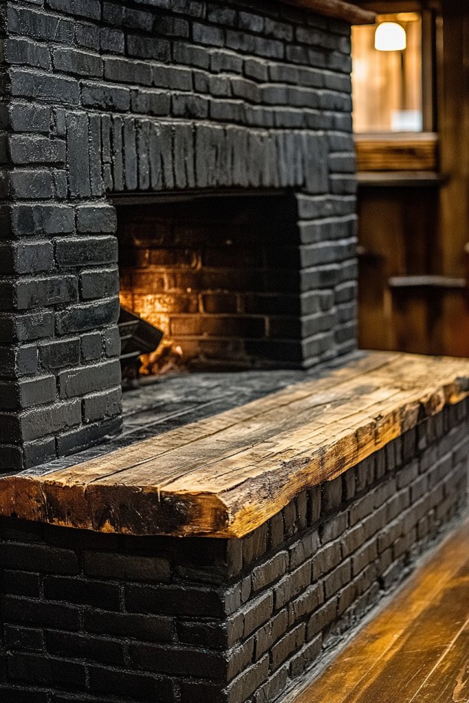 8. Rustic Black Brick Fireplace with Reclaimed Wood Hearth