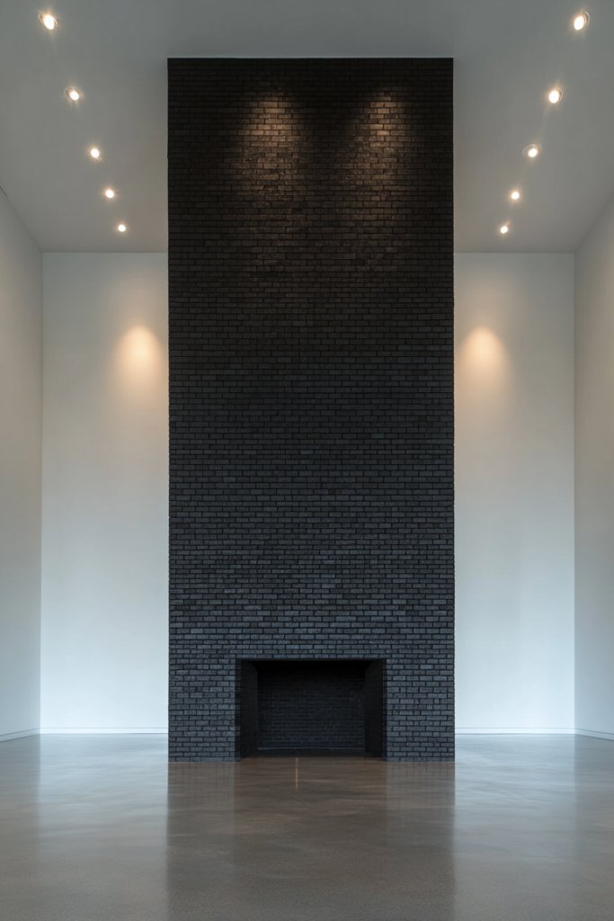 Visualize a wall entirely covered in matte black brick, with the bricks laid in a vertical or staggered pattern to emphasize height. The seamless continuity makes the fireplace feel like part of the architecture rather than a separate element. Ambient lighting or wall washers highlight the texture, casting shadows that add drama. The space feels grand and modern, with a sense of depth and purpose. It’s like a piece of art dominating the room.