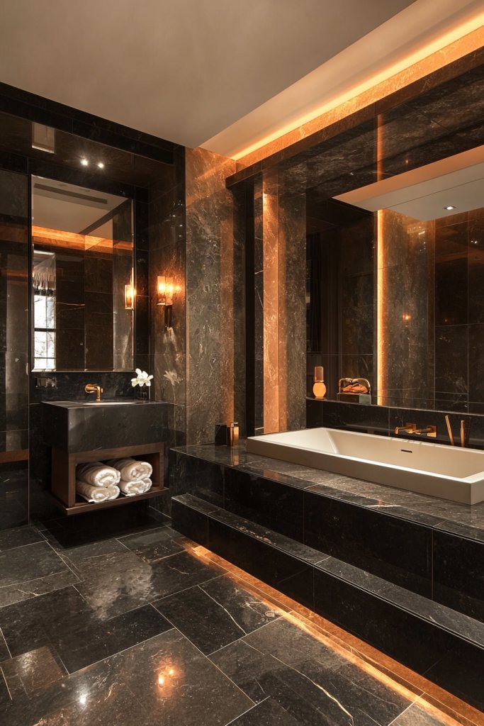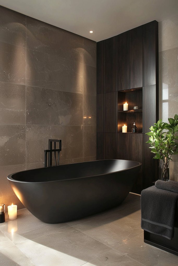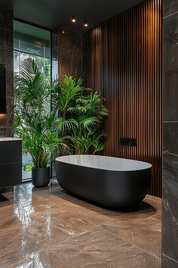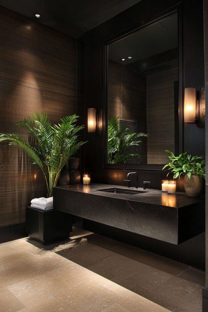 Whether it’s a beautifully crafted vanity or elegant shelving, black wood adds a layer of organic texture that softens the overall aesthetic. Consider incorporating reclaimed black wood for a rustic touch, or opt for a smooth finish to maintain a modern vibe.