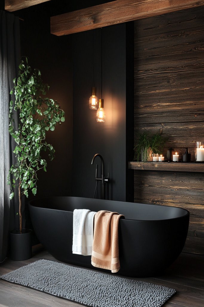 Textures play a crucial role; perhaps a woven black basket for storage or black ceramic tiles that evoke a vintage feel. Don’t forget the finishing touches: a rustic black light fixture, perhaps with Edison bulbs, can illuminate the room while accentuating its earthy aesthetic. By thoughtfully integrating these black elements, you’ll create a bathroom that feels both sophisticated and inviting, where rustic charm meets contemporary flair in perfect harmony.