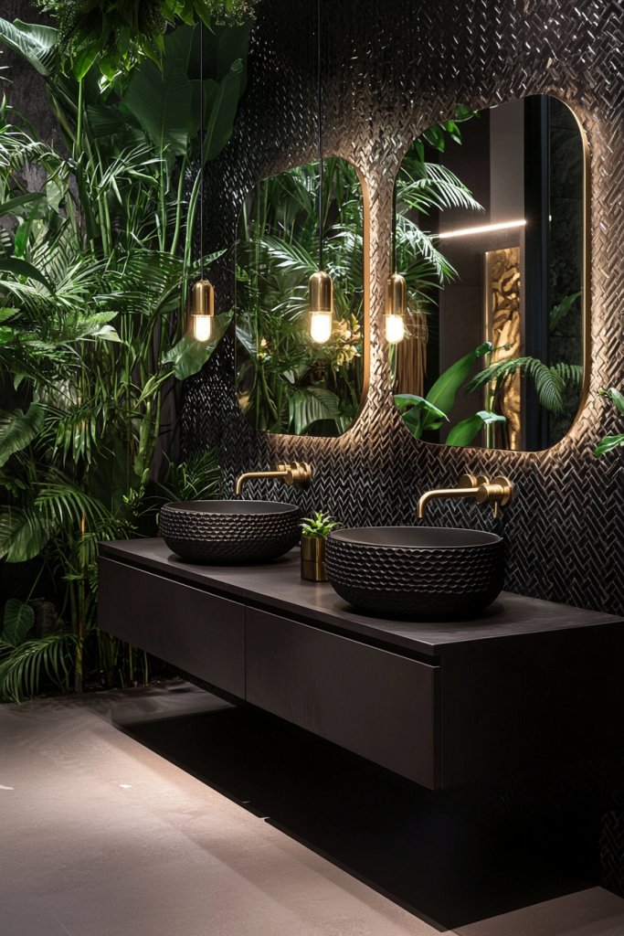 You could opt for a striking black vanity topped with a reclaimed wood surface, merging modern elegance with rustic warmth. Consider black-framed mirrors to enhance the space, reflecting light and creating a bold focal point.