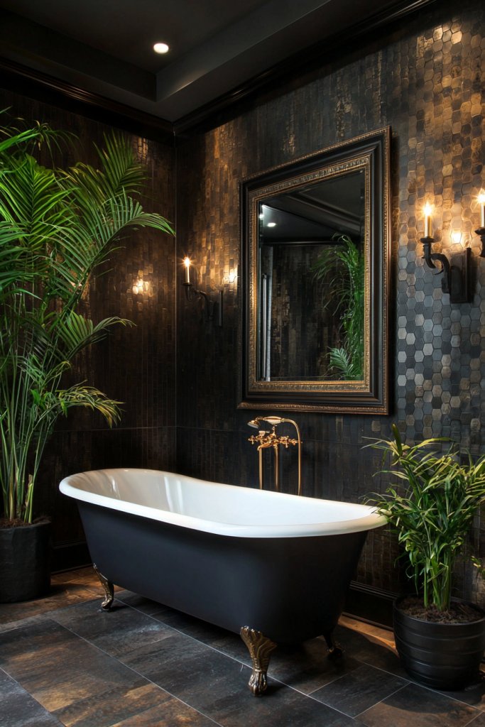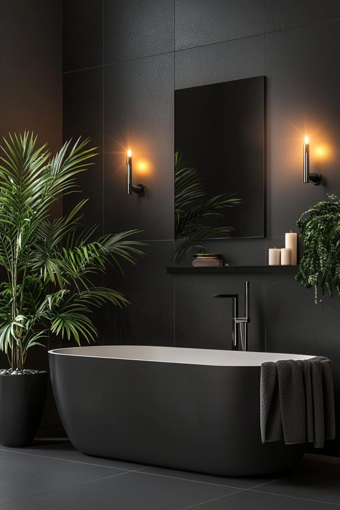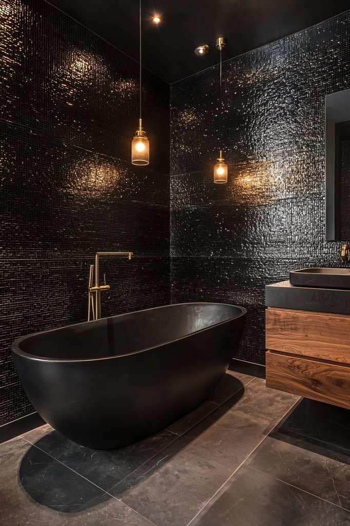 To soften the look, complement the tiles with warm wood tones or vibrant greenery. With the right lighting, bold black tiles can reflect and enhance the overall ambiance, making your bathroom a stylish sanctuary you’ll love to retreat to.