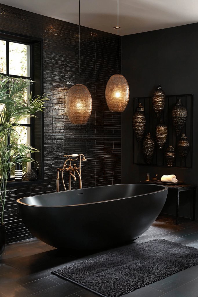 Or picture an elegant black chandelier hanging gracefully above a freestanding tub, casting intricate shadows across the room. Choosing matte black finishes can add a modern touch, while polished black elements exude glamour.