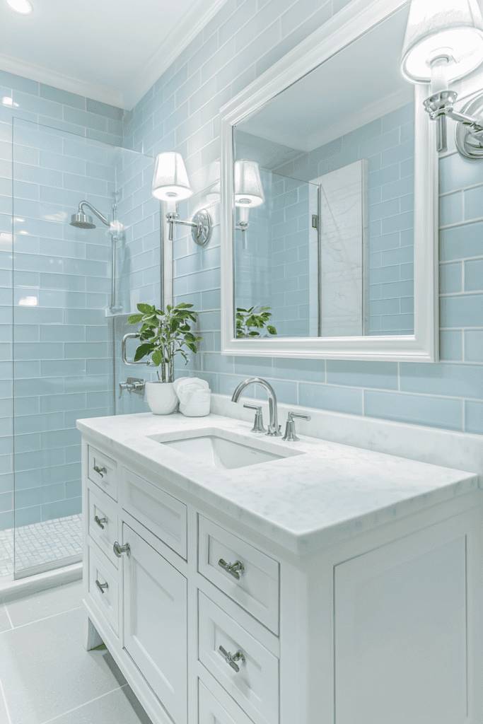 A soft blue bathroom creates a tranquil and refreshing ambiance, perfect for unwinding after a long day. The light blue subway tiles exude a clean and airy feel, while the white vanity with a marble countertop adds a timeless touch. The strategic use of mirrors enhances brightness by reflecting natural and artificial light, making the space feel more open. Small decor elements like a potted plant and neatly folded towels introduce warmth and personality, preventing the space from feeling too sterile.