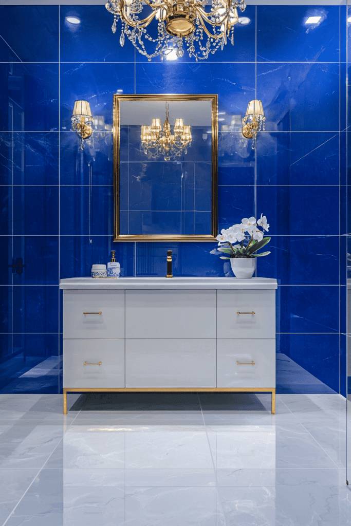 Bold cobalt blue tiles paired with gold accents create a regal and sophisticated atmosphere in this glamorous bathroom. The high-gloss finish of the tiles enhances depth and drama, reflecting light beautifully to create an almost jewel-like effect. A large ornate mirror with a gold frame serves as a statement piece, reinforcing the luxurious aesthetic. The white vanity provides a crisp contrast, ensuring that the deep blue hues don’t overpower the space.