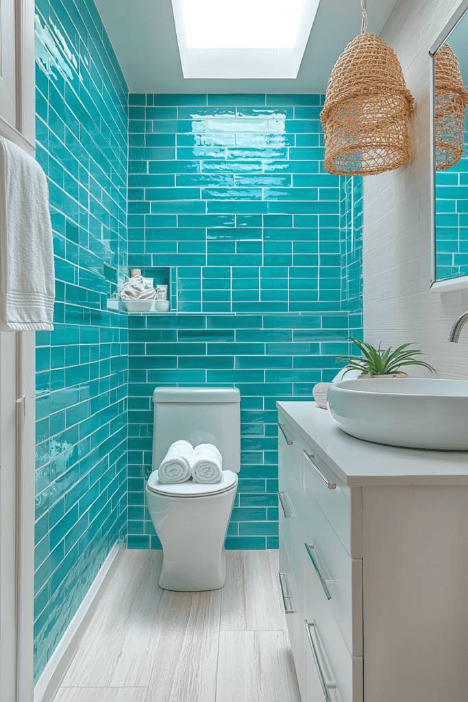 Turquoise subway tiles instantly brighten this bathroom, evoking a refreshing coastal feel. The glossy finish of the tiles reflects natural light streaming in from the skylight, creating a radiant and spacious effect. A clean white vanity with sleek handles complements the fresh, breezy aesthetic, while a vessel sink adds a modern touch. Woven pendant lights bring warmth and texture, infusing the space with a casual beachy vibe.