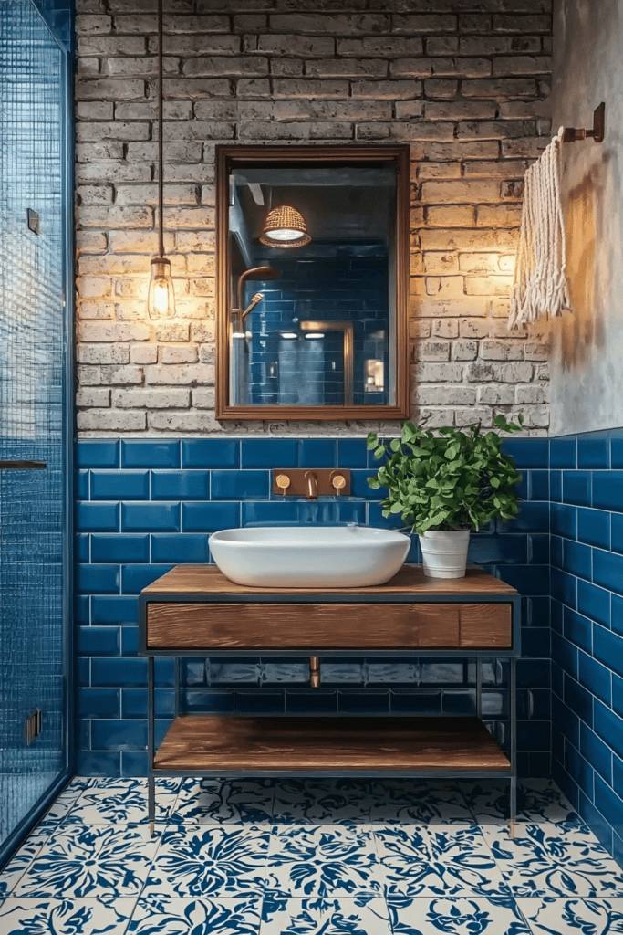 Exposed brick walls and navy blue subway tiles create an edgy yet inviting industrial-style bathroom. The raw texture of the brick adds character, while the rich blue tiles provide a bold contrast, making the space feel refined. A floating wooden vanity with a metal frame enhances the rustic aesthetic, balancing warmth with modern minimalism. Industrial-style lighting fixtures with exposed bulbs complete the look, adding an element of vintage charm.