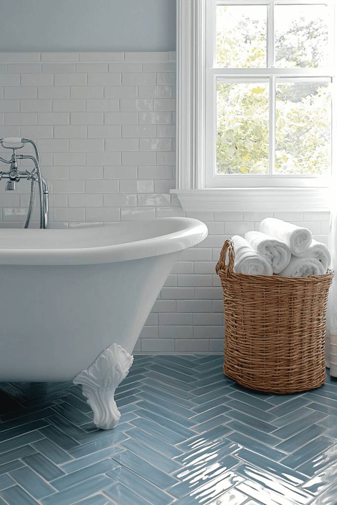 A classic clawfoot tub sits gracefully in this serene bathroom, embodying vintage sophistication. Soft blue herringbone tiles on the floor provide a subtle yet impactful design element, enhancing the space with texture and depth. White subway tiles on the walls create a bright, clean atmosphere, ensuring the room feels airy and inviting. A woven basket filled with plush towels adds a charming, spa-like touch to the setup.
