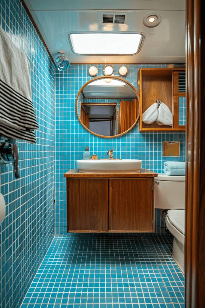 A small bathroom with turquoise mosaic tiles can feel both nostalgic and refreshing, creating a vintage-meets-modern aesthetic. The wooden vanity and cabinetry add warmth to the vibrant blue backdrop, ensuring the space feels cozy rather than overwhelming. A round mirror framed in wood complements the mid-century vibe, while gold-toned fixtures enhance the overall retro charm. The strategic placement of lighting fixtures ensures the room remains well-lit, balancing the deeper tones of the walls.