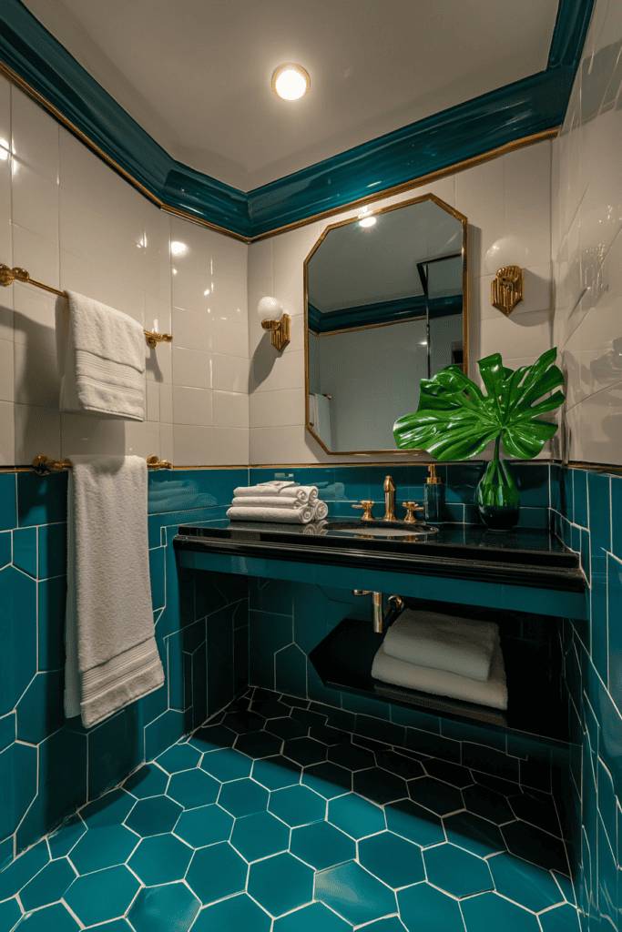 Hexagonal floor tiles in a rich teal shade introduce visual intrigue, transforming the bathroom into a modern retreat. The contrast between dark teal and crisp white wall tiles ensures the space feels balanced rather than overwhelming. Gold fixtures and accents, such as sconces and towel bars, provide a luxurious finish, making the room feel opulent yet inviting. A geometric mirror enhances the overall aesthetic, reinforcing the sophisticated design approach.