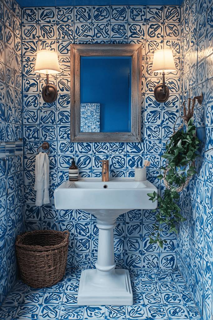 Hand-painted blue and white tiles create a Mediterranean-inspired sanctuary, filled with charm and personality. The intricate patterns lend an artisanal feel, making the bathroom a unique and inviting space. A pedestal sink adds to the traditional aesthetic, keeping the design airy and uncluttered. Rustic elements like a woven basket and natural wood-framed mirror introduce warmth, preventing the blue hues from feeling too cold.